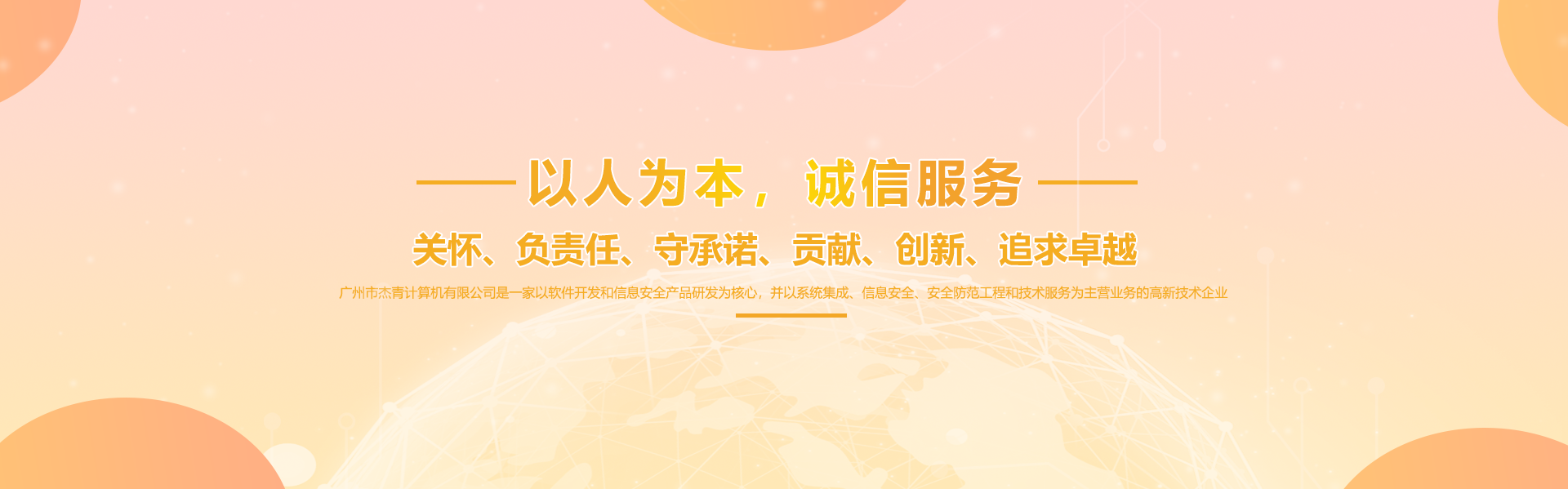 廣州市杰青計(jì)算機(jī)有限公司成立于2002年,是一家以各行業(yè)解決方案應(yīng)用為核心,以系統(tǒng)集成、信息安全和技術(shù)服務(wù)為主營(yíng)業(yè)務(wù)的高新技術(shù)企業(yè)。作為成立二十二年的系統(tǒng)集成公司,杰青始終堅(jiān)持“關(guān)懷、負(fù)責(zé)任、守承諾、貢獻(xiàn)、創(chuàng)新、追求卓越”的企業(yè)文化,“以人為本,誠(chéng)信服務(wù)”服務(wù)理念,致力于為政府、教育、醫(yī)療、制造等行業(yè)提供先進(jìn)可靠的信息產(chǎn)品和全面的綜合解決方案。