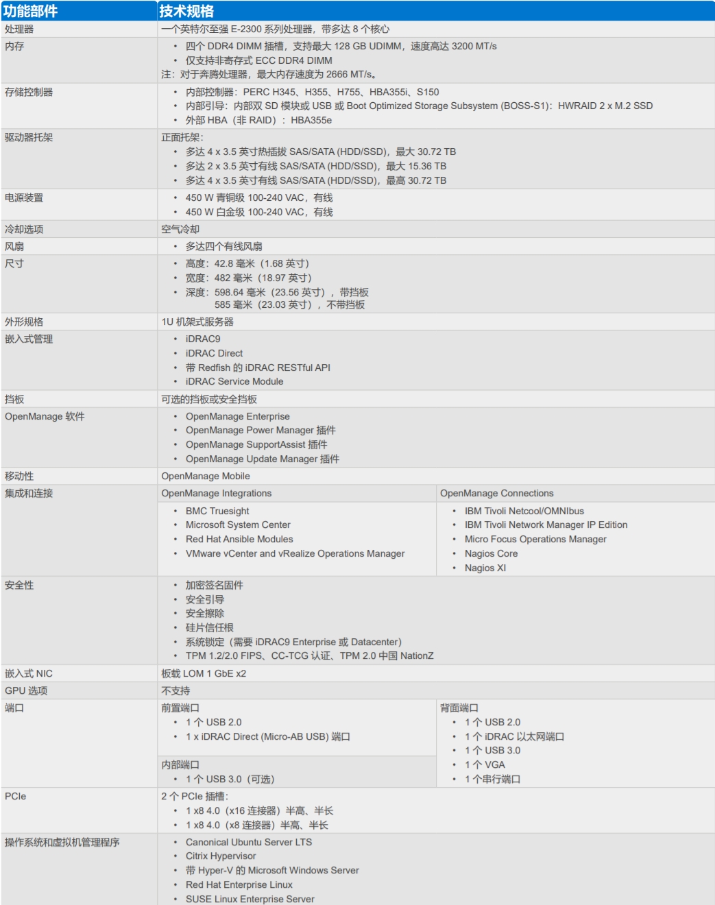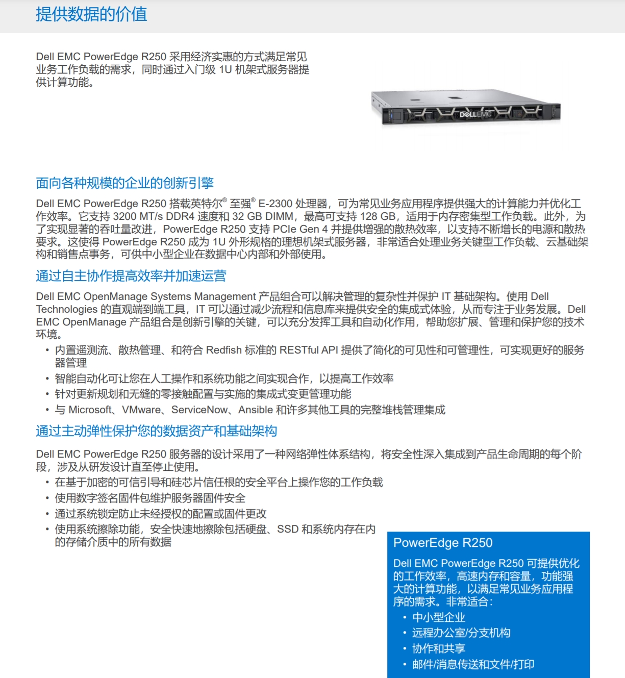 Dell EMC PowerEdge R250 采用經(jīng)濟(jì)實(shí)惠的方式滿足常見業(yè)務(wù)工作負(fù)載的需求,同時(shí)通過入門級(jí) 1U 機(jī)架式服務(wù)器提供計(jì)算功能。