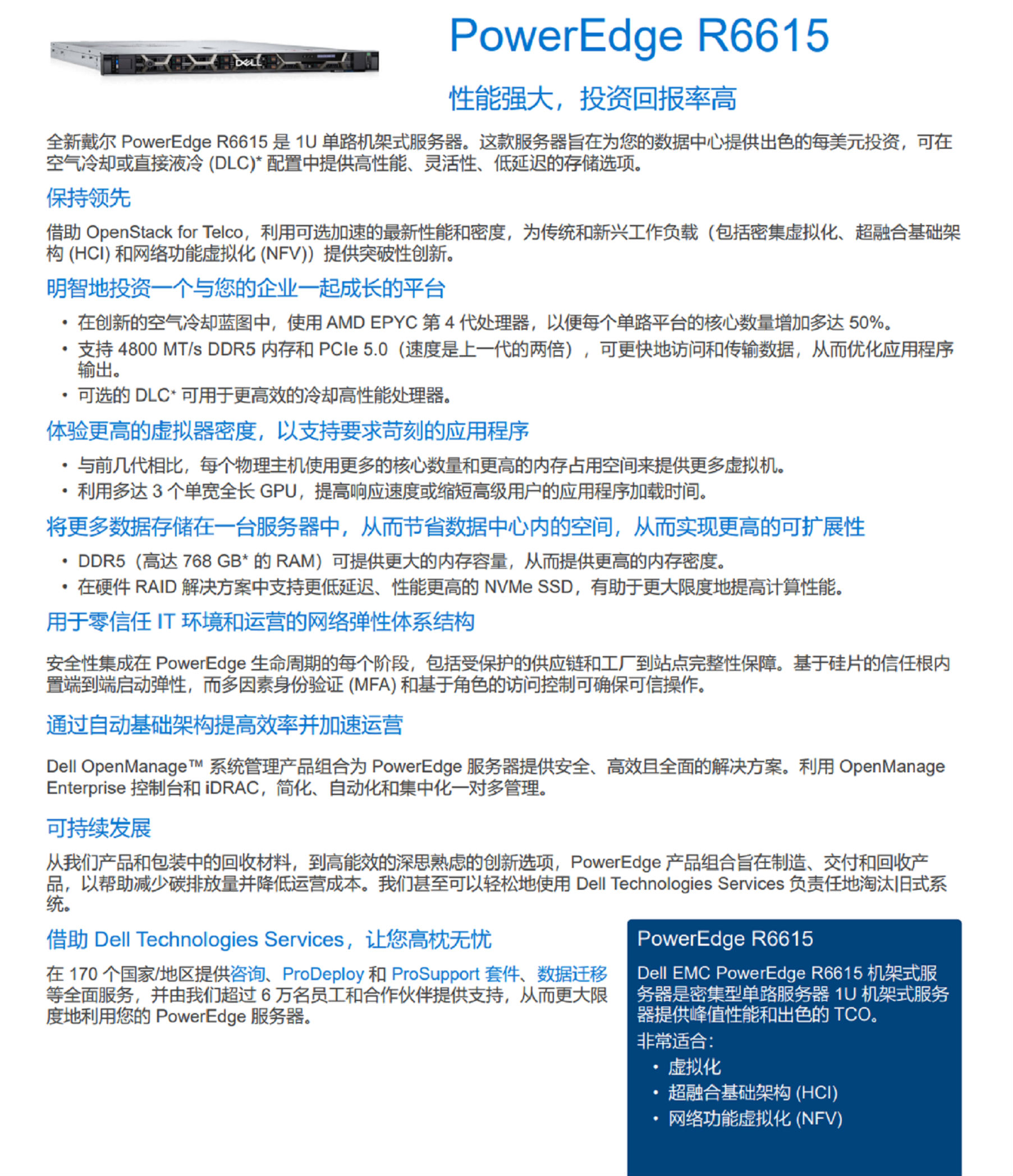 全新戴爾 PowerEdge R6615 是 1U 單路機(jī)架式服務(wù)器。這款服務(wù)器旨在為您的數(shù)據(jù)中心提供出色的每美元投資,可在空氣冷卻或直接液冷 (DLC)* 配置中提供高性能、靈活性、低延遲的存儲選項。