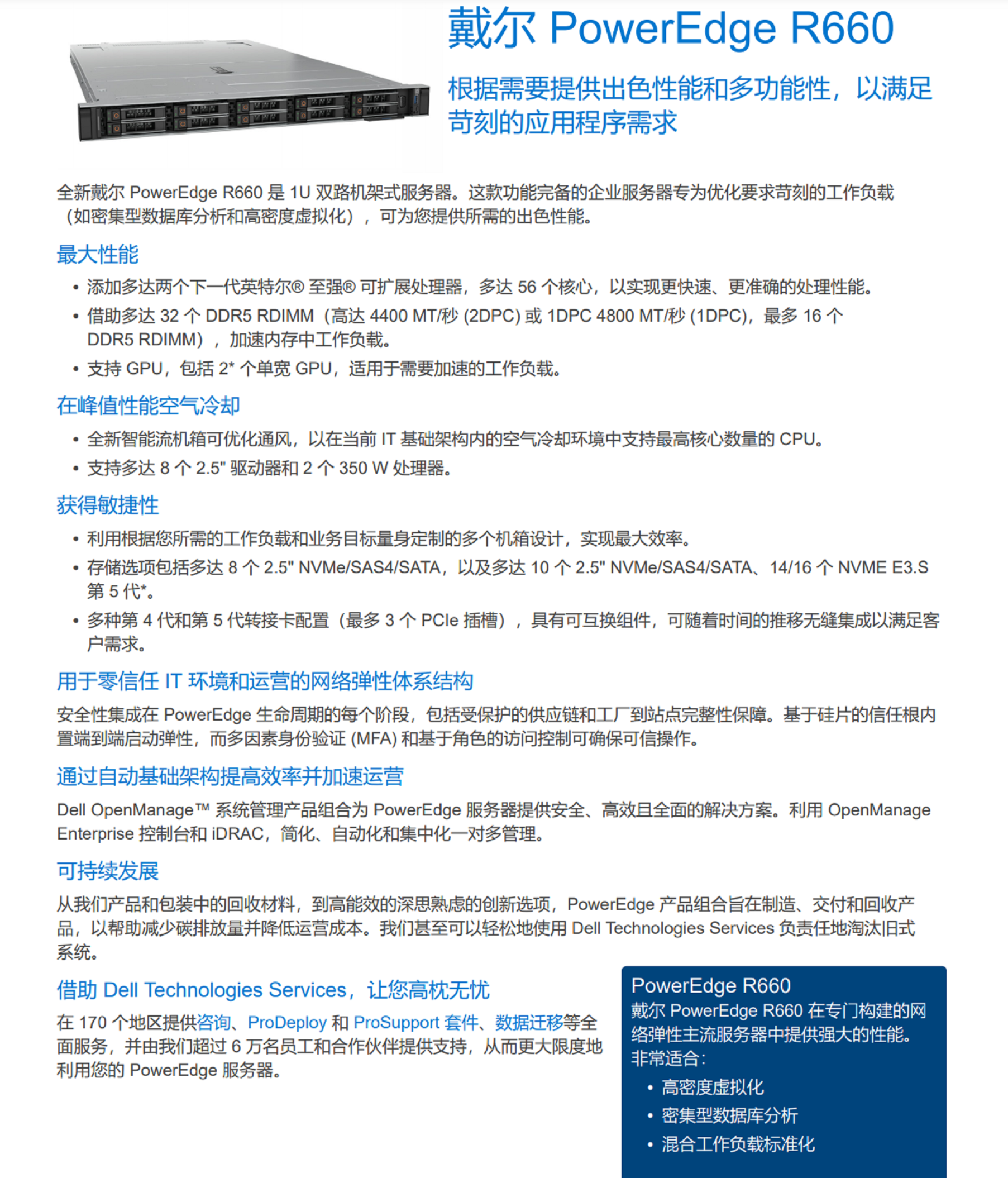 全新戴爾 PowerEdge R660 是 1U 雙路機架式服務(wù)器。這款功能完備的企業(yè)服務(wù)器專為優(yōu)化要求苛刻的工作負(fù)載(如密集型數(shù)據(jù)庫分析和高密度虛擬化),可為您提供所需的出色性能。