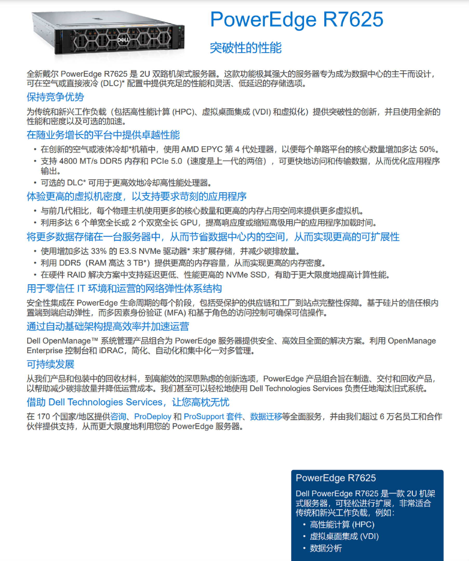 全新戴爾 PowerEdge R7625 是 2U 雙路機(jī)架式服務(wù)器。這款功能極其強大的服務(wù)器專為成為數(shù)據(jù)中心的主干而設(shè)計,可在空氣或直接液冷 (DLC)* 配置中提供充足的性能和靈活、低延遲的存儲選項。