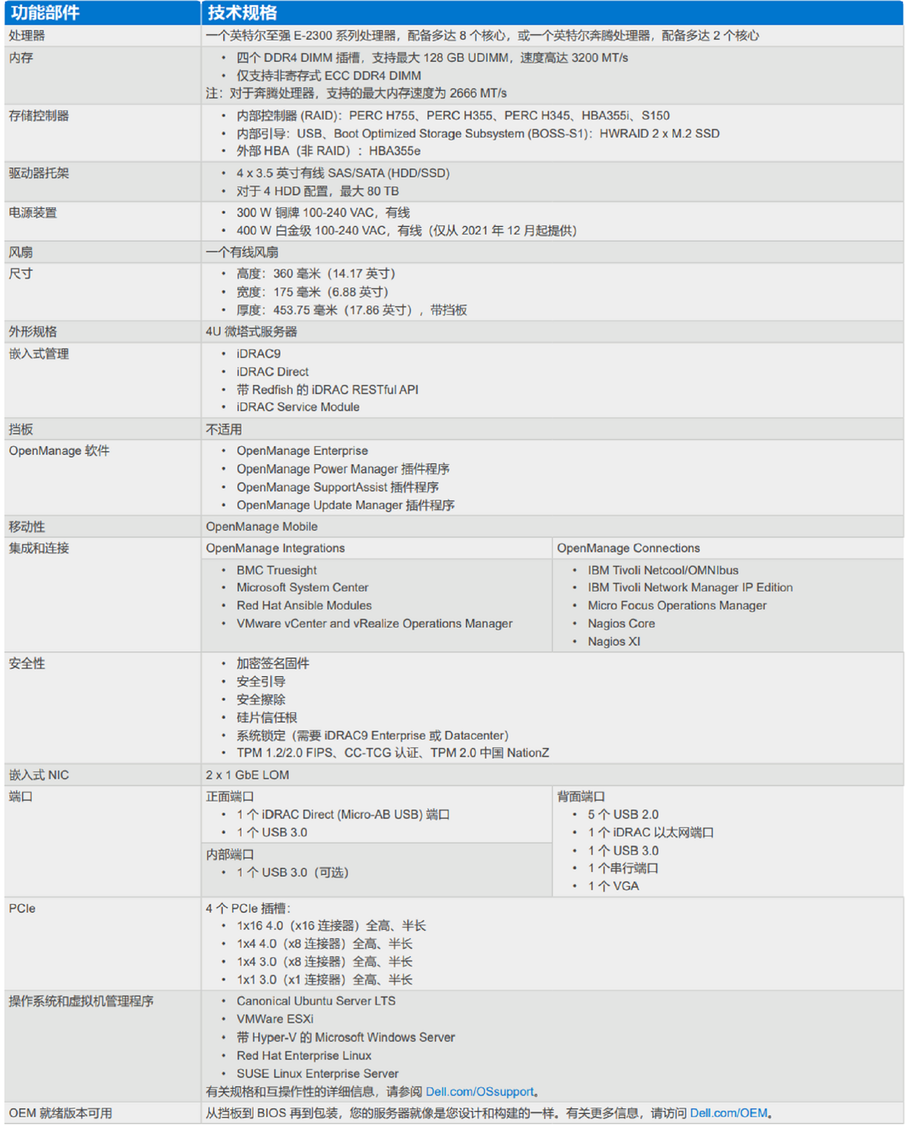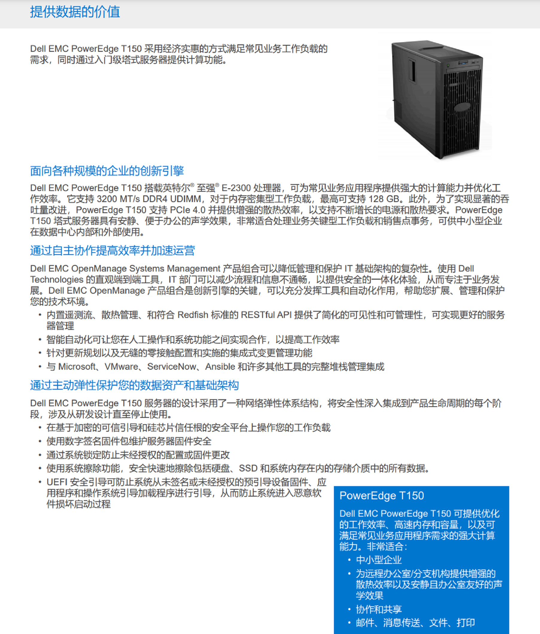 PowerEdge T150 采用英特爾? 至強? E-2300 處理器,是一款入門級塔式服務(wù)器,在適應(yīng)性與經(jīng)濟實惠性之間實現(xiàn)了出色平衡,可滿足不斷變化的計算需求。