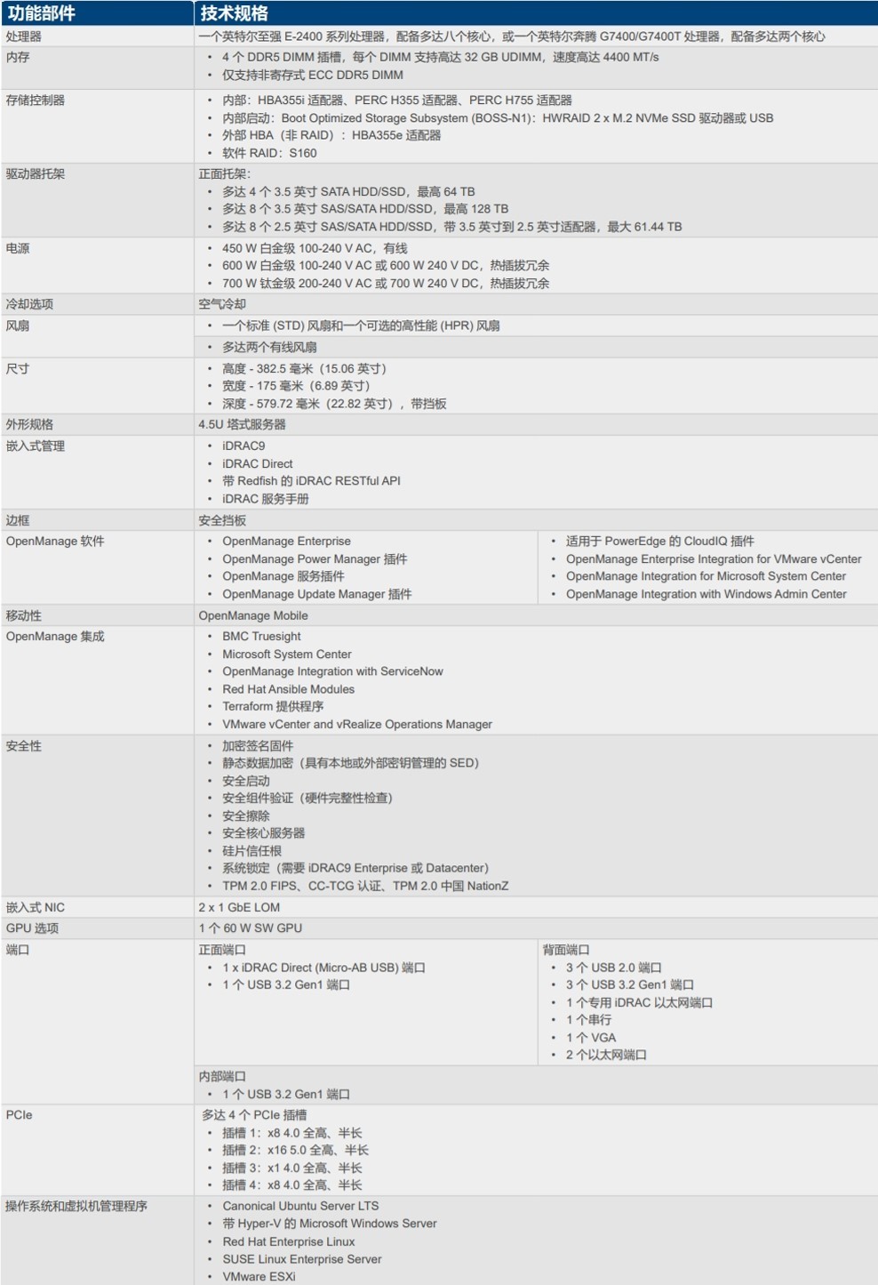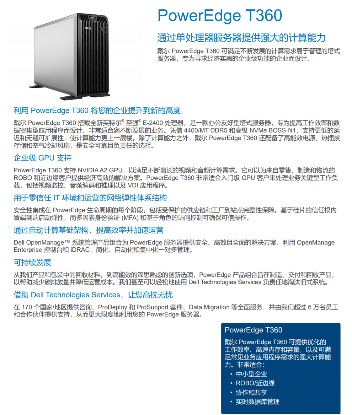 4.5U 單路 PowerEdge T360 的外形規(guī)格經(jīng)過專門設(shè)計(jì),非常適合需要多功能性、經(jīng)濟(jì)性和處理能力的客戶。