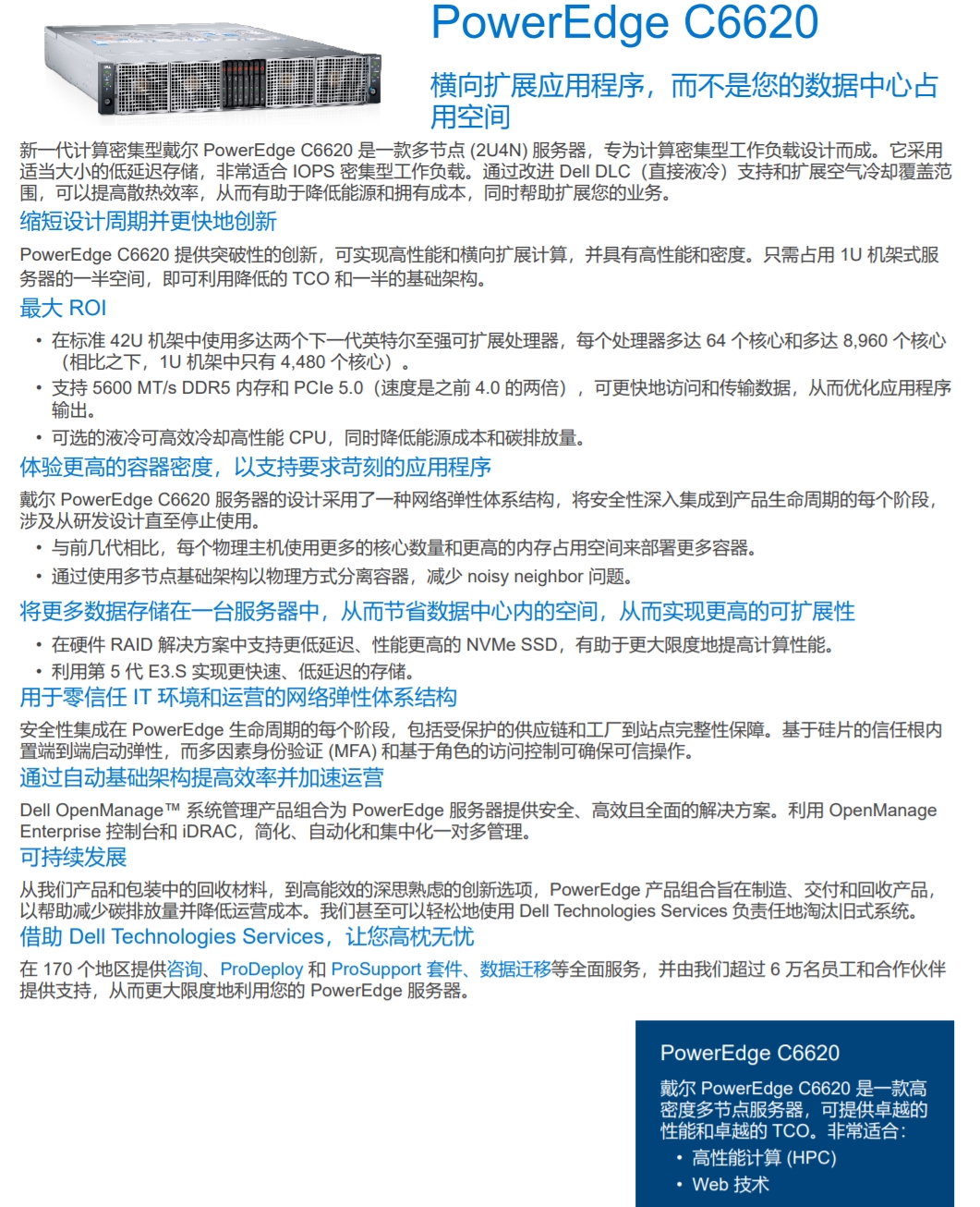 新一代計(jì)算密集型戴爾 PowerEdge C6620 是一款多節(jié)點(diǎn) (2U4N) 服務(wù)器,專(zhuān)為計(jì)算密集型工作負(fù)載設(shè)計(jì)而成。它采用適當(dāng)大小的低延遲存儲(chǔ),非常適合 IOPS 密集型工作負(fù)載。通過(guò)改進(jìn) Dell DLC(直接液冷)支持和擴(kuò)展空氣冷卻覆蓋范圍,可以提高散熱效率,從而有助于降低能源和擁有成本,同時(shí)幫助擴(kuò)展您的業(yè)務(wù)。