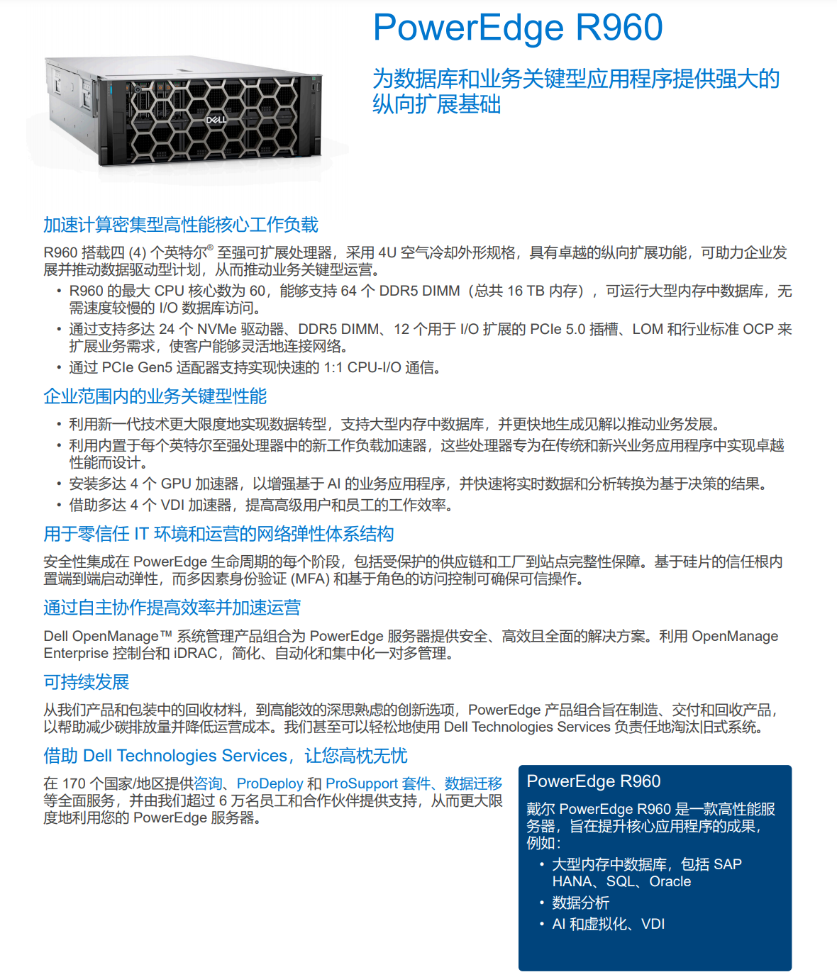 R960 搭載四 (4) 個英特爾? 至強(qiáng)可擴(kuò)展處理器,采用 4U 空氣冷卻外形規(guī)格,具有卓越的縱向擴(kuò)展功能,可助力企業(yè)發(fā)展并推動數(shù)據(jù)驅(qū)動型計劃,從而推動業(yè)務(wù)關(guān)鍵型運(yùn)營。